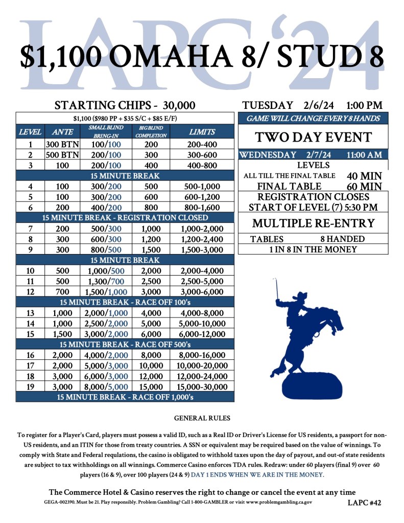 We are switching back to Mixed Games for the afternoon event, as the $1,100 Omaha 8/Stud 8 event has just kicked off. This is a two day event that will wrap up tomorrow at 11 AM.