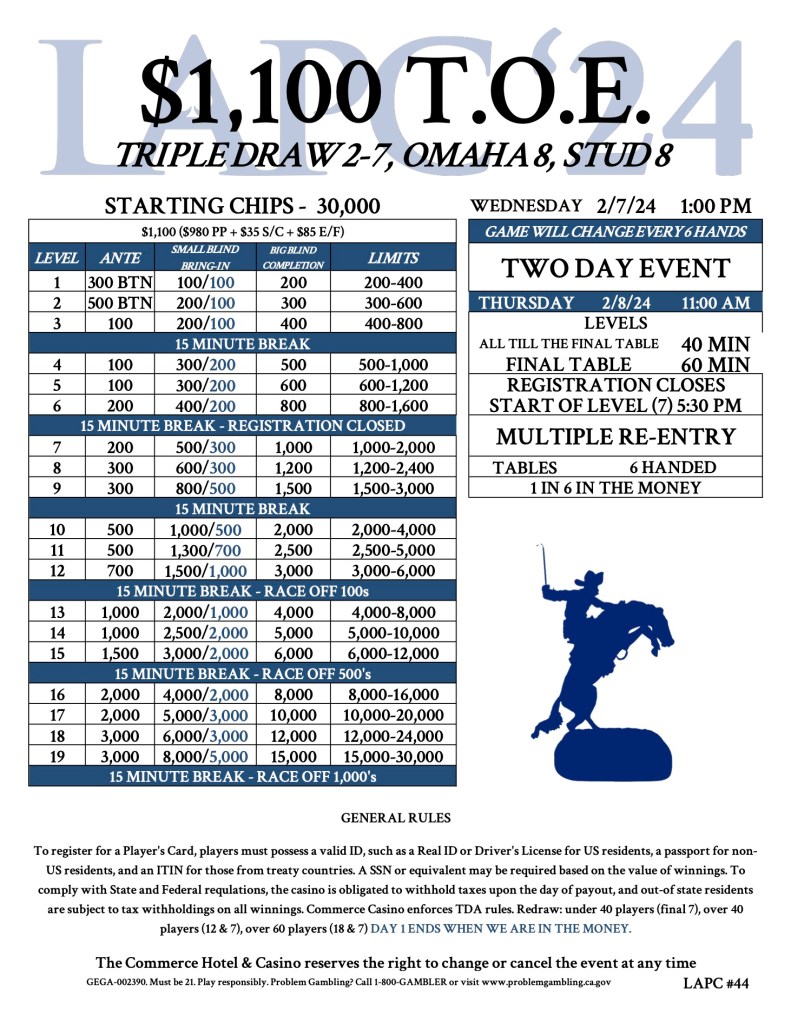 The afternoon event has just kicked off, and today, it is a $1,100 T.O.E Event. The games today are Triple Draw, Omaha 8, and Stud 8. This is a two day event that will wrap up tomorrow at 11 AM.