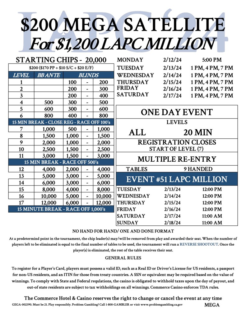 The first of three Mega satellites for the LAPC Million Event has just kicked off here at the Commerce Casino. This is a $200 buy-in event where one in six players will be earning a discounted seat to the $1,200 Event.