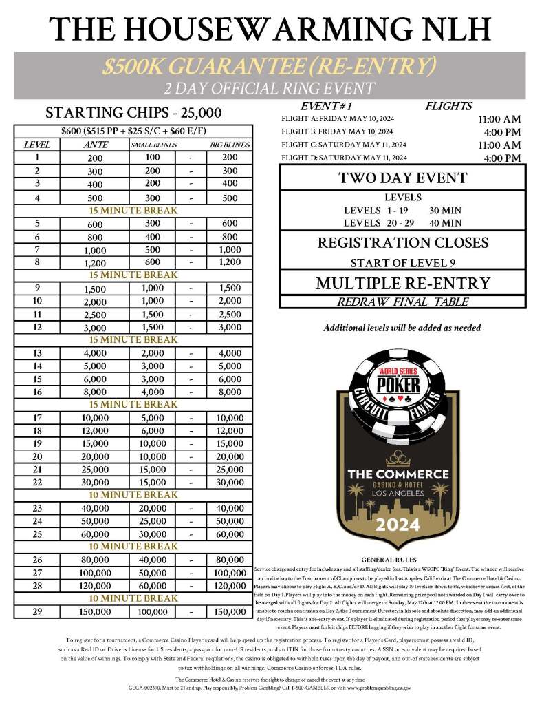 The second starting session of this massive $500,000 Guaranteed Housewarming event has just kicked off here in the tournament ballroom. Our Commerce Poker Pro Team only received a free buy-in to this morning’s session, but they are welcome to enter this flight just like all the other players.