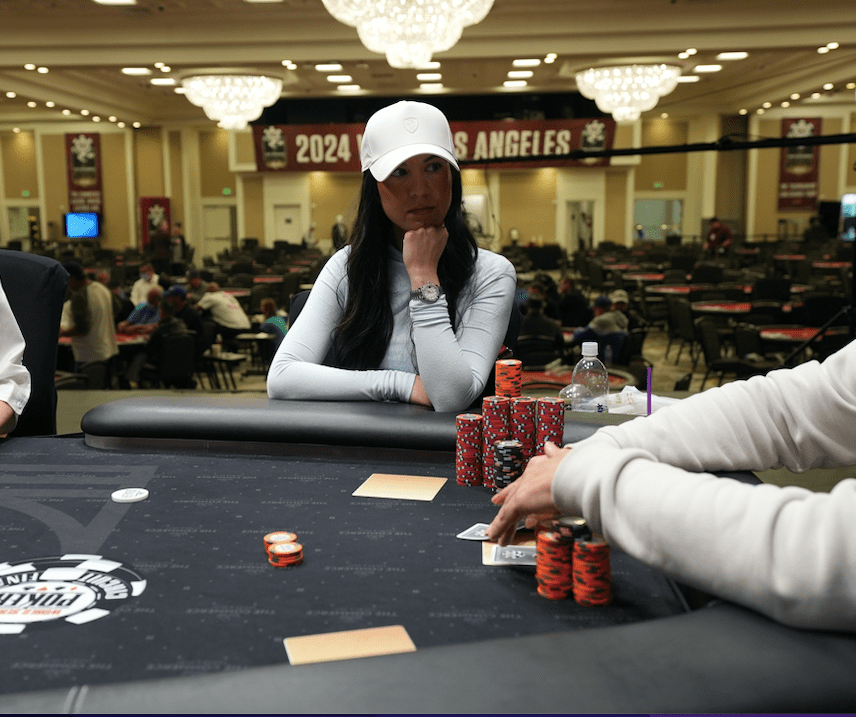 Christina Gollins limped on the button, and after Weiqiang Zhao moved all in, Gollins called to put him at risk with [Ah][8c]. She was happy to see she had Zhao just outkicked with [Ac][7d], and the flop of [As][5d][3c] kept her in the lead.