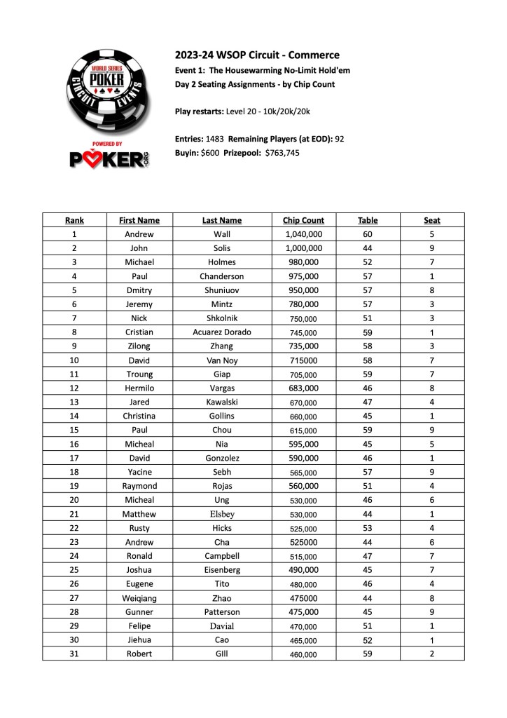Andrew Wall and John Solis bagged the only seven figure stacks in the field last night, and they will be leading the list of 92 players coming back today to battle it out for a first place prize of over $100,000. Stay tuned for the full payouts, and check out the full Day 2 list below!