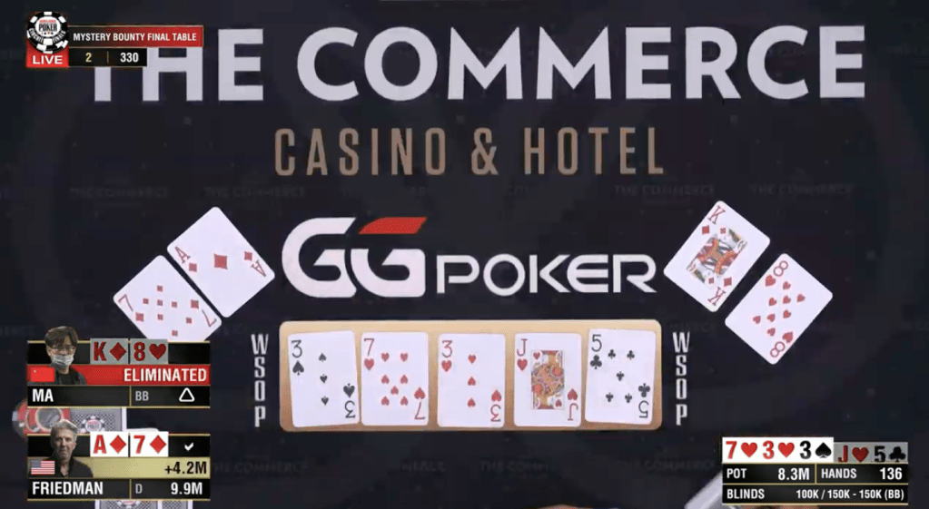 The flop of [7h][3h][3s] gave Friedman two pair, and left Ma drawing thin. The [Jh] turn give him hearts for outs, but the river was the [5c], giving Friedman the win.