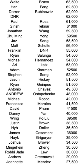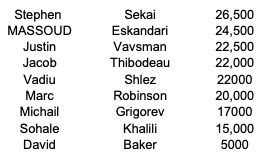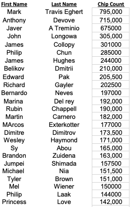 Below you will see the Day 2 list for our $2,200 High Roller Event, which will continue at 1 PM today. Two time ring winner Travis Eghert bagged the biggest stack with 795,000, followed by WSOP bracelet winner Anthony Denove.