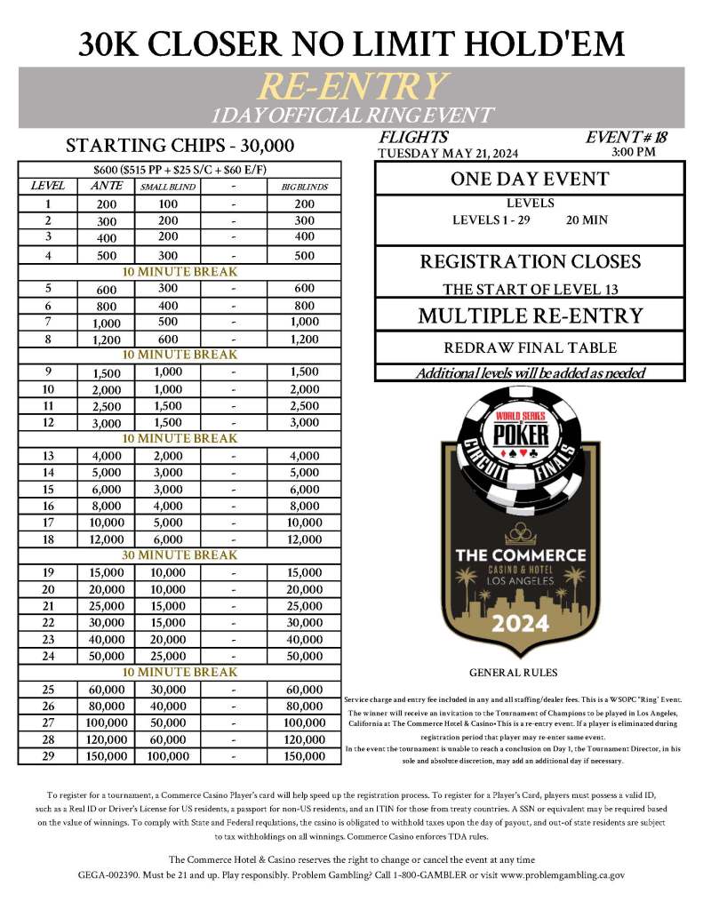 And just like that, nearly two weeks of open ring events are coming to an end here at the Commerce Casino, as the $30,000 Guaranteed Closer Event has started. This $600 buy-in event is your last chance to join the list of ring winners at this series, and punch your ticket to the Tournament of Champions, which kicks off tomorrow!