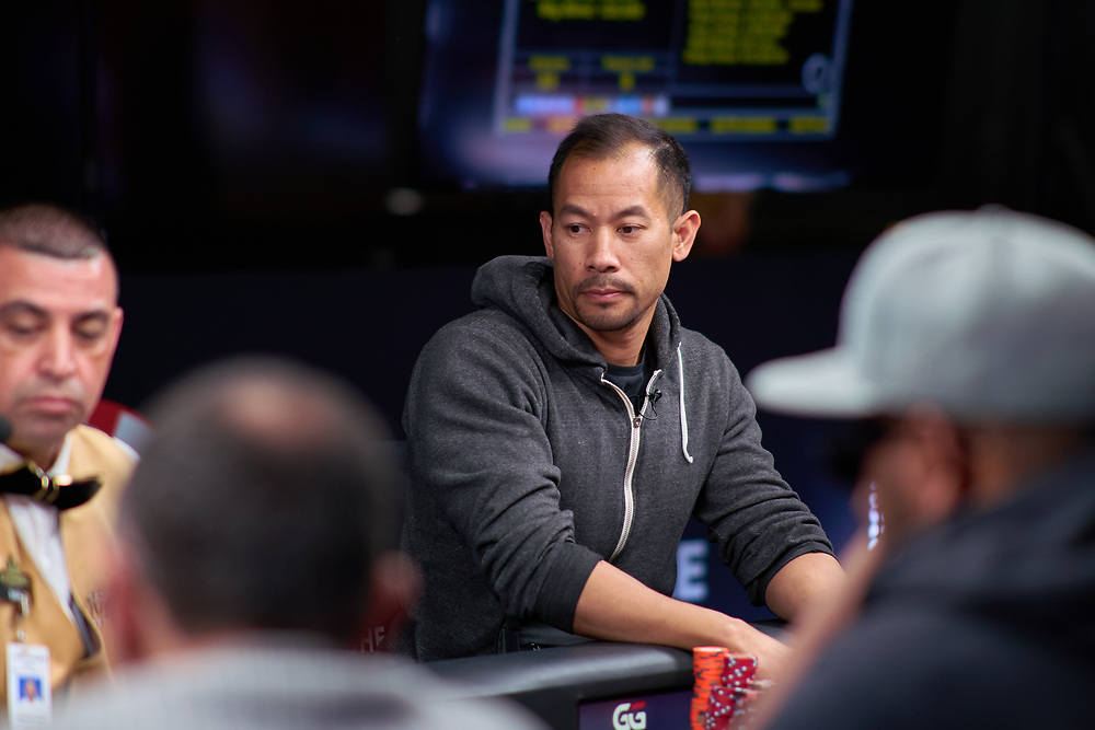Karschamroon thought for about a minute before slamming a stack of chips in for the call, and he showed [Ac][10s]. Cervantes had him in bad shape with [Jh][Js], and it went from bad to worse after the flop came [Jc][10c][6h] to give Cervantes top set. A deuce on the turn ended things, and suddenly the Commerce Team Pro had a hefty chip lead three handed.
