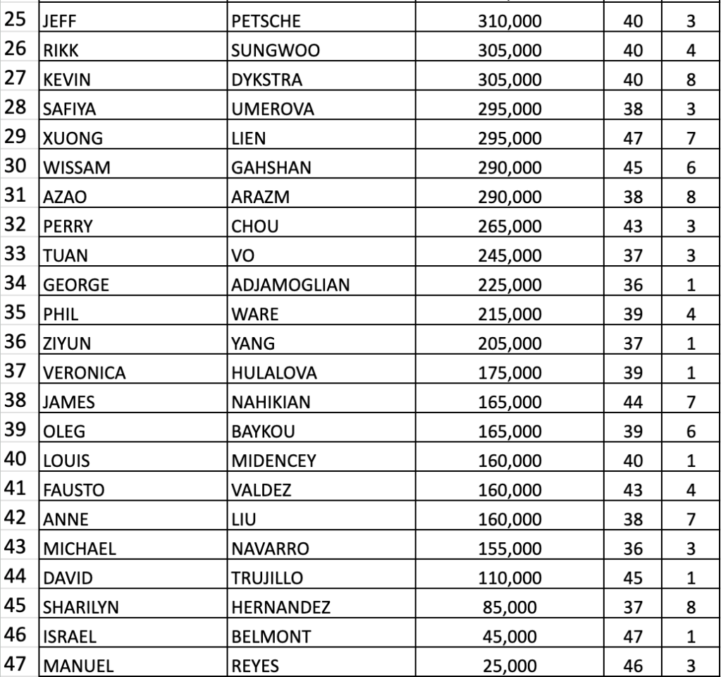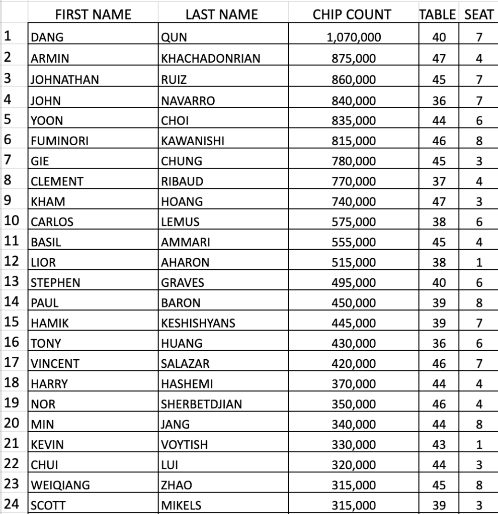 Below you will see the 47 players who advanced to the Day 2 finals from yesterday’s two starting sessions. As we reported last night, Dang Qun is the only stack over a million in chips, with Armin Khachadonrian in second place.