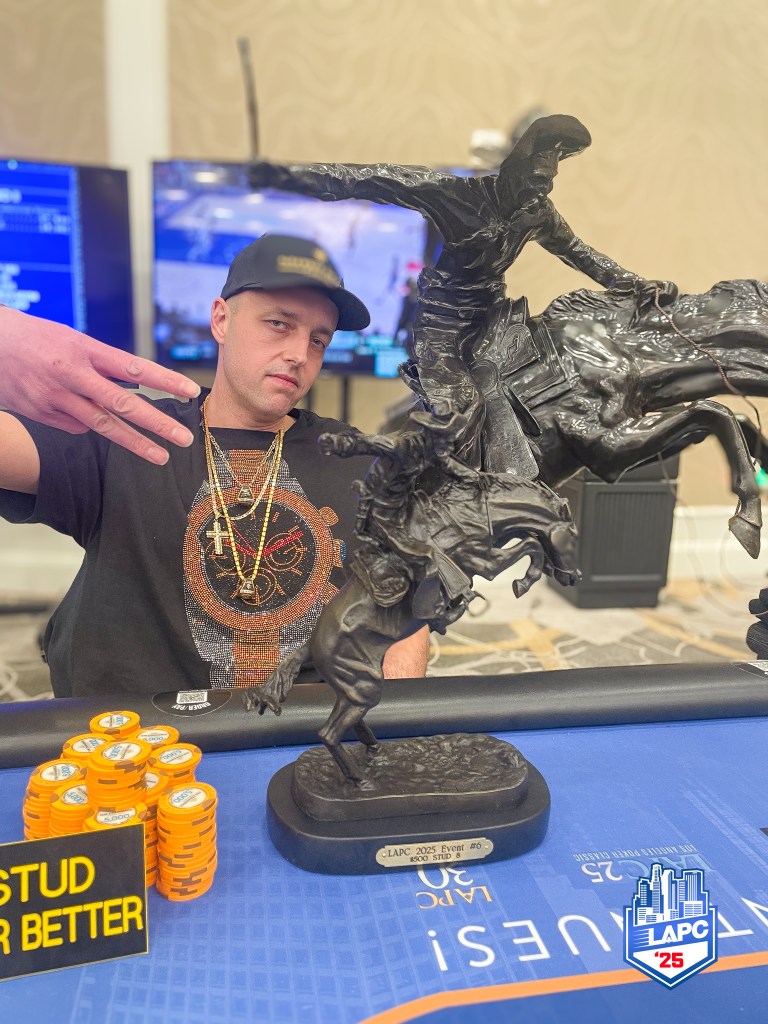 Also at this final table are LA regulars Joey Deluca and Gregory Sanchez, and as the title indicates, David Brookshire (pictured above), who is looking to continue his hot streak of cashes in these events.