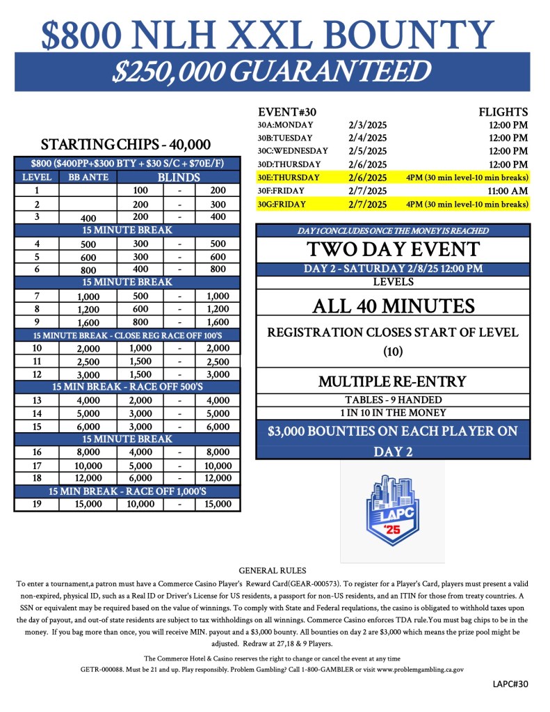 It’s time for the next session here in $250,000 Guaranteed XXL Bounty event! This tournament has an $800 buy-in, giving players 40,000 in chips to start with, and the top 10% will move on to Day 2 on Saturday. There, all bounties will be worth $3,000.