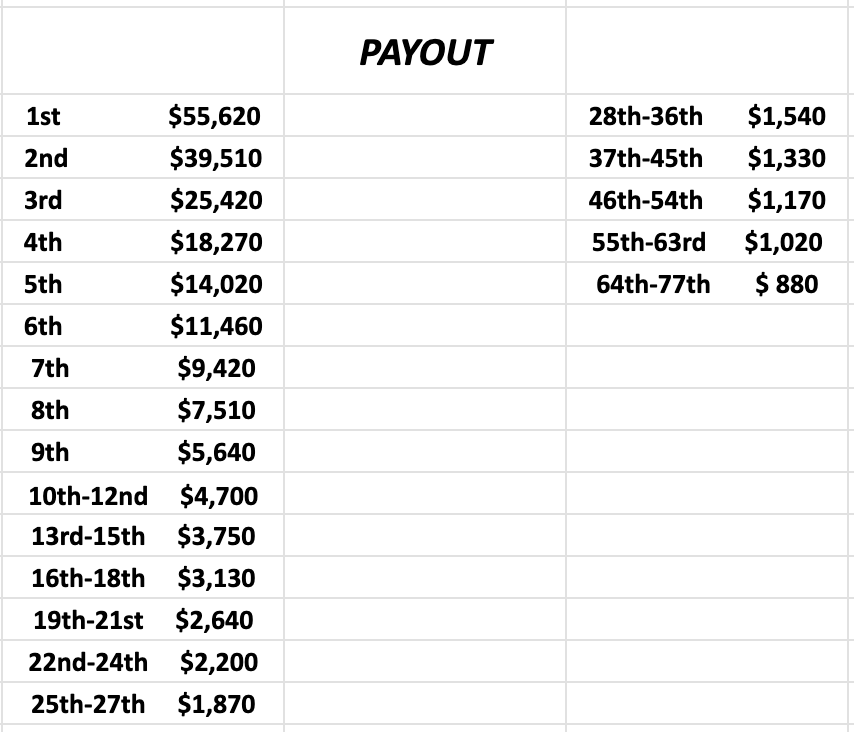 Below you will see the payouts for the final 77 players coming back today. First place in this event will earn over $55,000. However, that player will certainly be taking home more than that, as every elimination today will be worth $3,000 in cold hard cash.