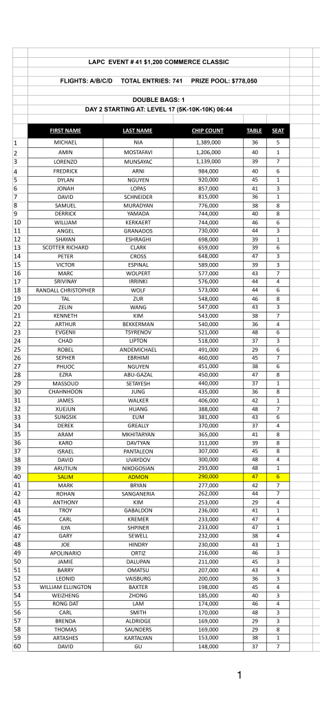 Chip leading into day 2 currently is LA poker legend and everyones favorite Michael Nia with 1,389,000 chips