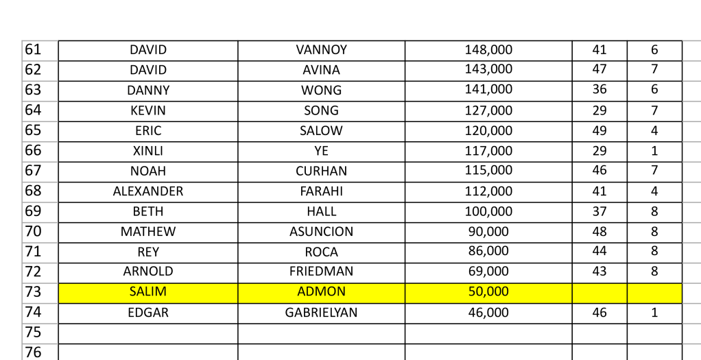 Saturday is apon us and the flight has already amassed to over 400 entrants, below is our updated chart of chip counts and seating arrangement going into day 2 monday. 2 more flights including todays at 4pm and tomorrows final day 1 flight at 11 am.