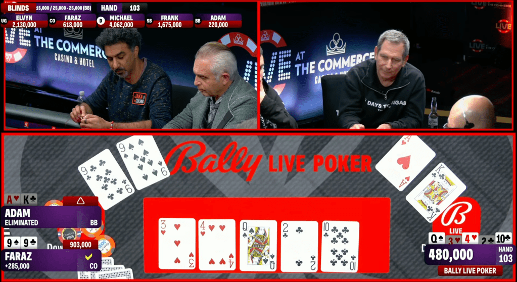 The board ran down [Qs][4h][3h][2c][10c], and the nines held for Jaka to get us to the final four players.