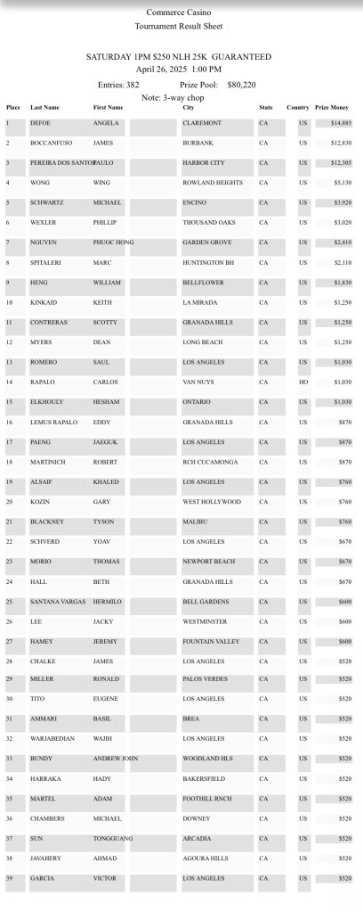 We had a record turn out! 382 players signed up with 39 making it in the money. final 3 players chopped with Angela Defoe taking first place. Results and photos from the field below.