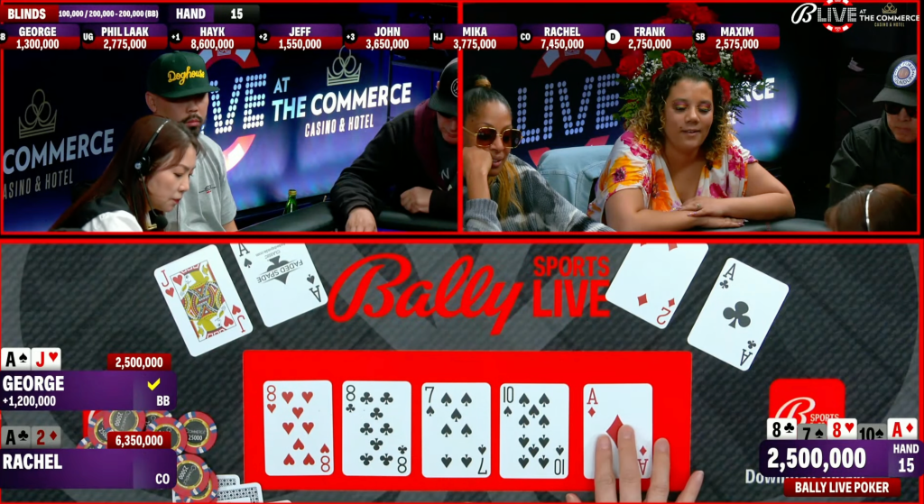 Rachel Gardner raised it up from the cutoff, and in the big blind, Dinh moved all in for 1,200,000. Gardner called with [Ac][2d], and saw she was dominated by the [As][Jh] of Dinh.