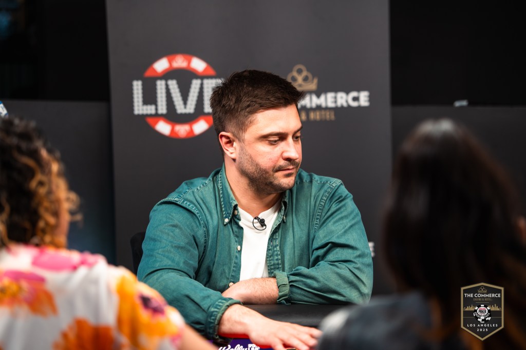 Action folded around to Frank Lin in the small blind, and he moved all in, easily having Maxim Lykov covered in the big blind. The Russian peeked down at [Ac][Js], and made the call for his last chips, and Lin was behind but had two live cards with [Ks][5h].