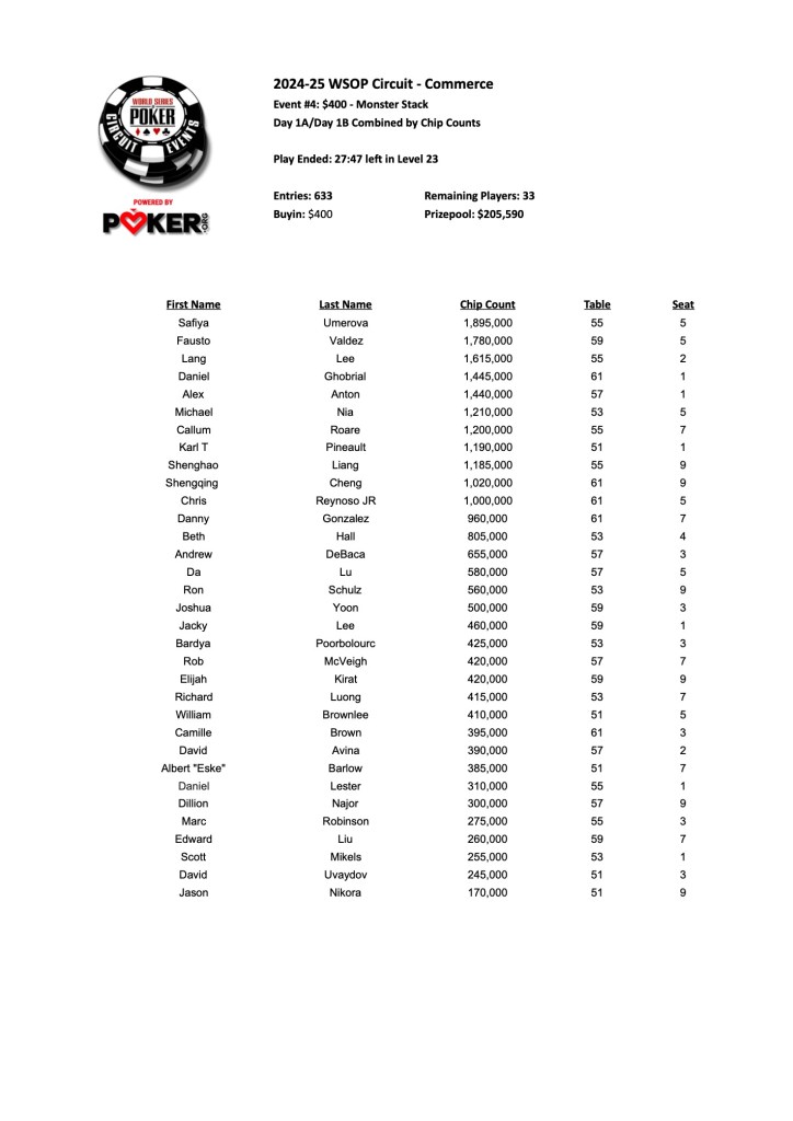 Yesterday saw 33 players move on from the first two starting sessions, with Safiya Umerova (pictured above) bagging the biggest stack with nearly two million in chips.
