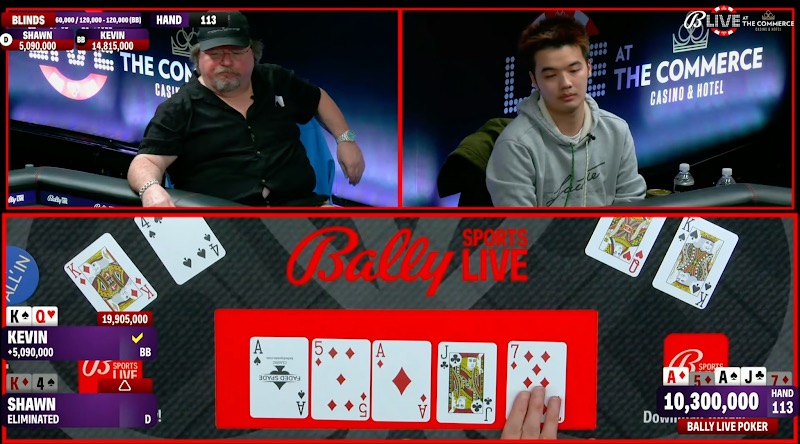 Shawn Rice jumped out to a 2:1 chip lead early on in this heads up battle, but Kevin Li slowly chipped away at his stack, and eventually took the lead back.